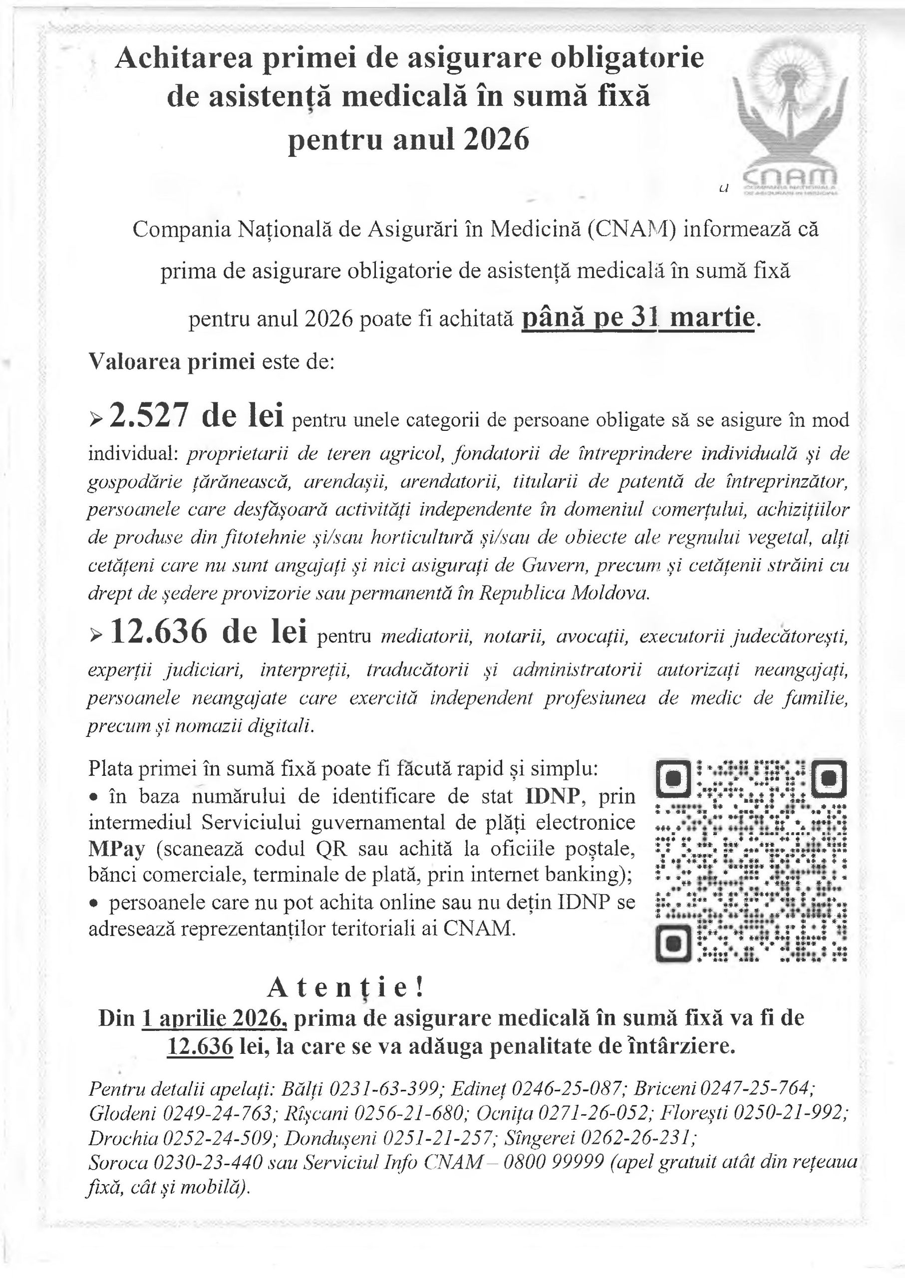 Anunț-prima de asigurare obligatorie de asistență medicală pentru anul 2026